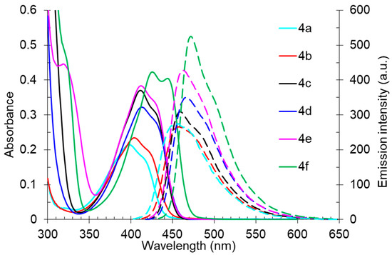 Studies of the photophysical properties of the 2-dibutylamino-substituted derivatives 4 showed that the absorption maxima of these compounds in toluene were in the range of 398–426 nm and were also characterized by intermediate values of light absorption coefficients (4300–8460 M−1 cm−1) (Table 3, Figure 7). The expected bathochromic shift in the absorption band along with an increase in intensity was observed for aryl-substituted derivatives 4c–f. Compound 4f, containing a spatially locked aromatic fragment, showed the biggest red shift and hyperchromic effect. The fluorescence bands of compound 4 were also in the blue region of the spectra, with maxima in the range of 456–472 nm, that also showed a bathochromic shift for aryl-substituted derivatives 4c–f. The photoluminescence quantum yields were in the range from 33% to 43%, and the highest emission intensity was also noted for compound 4f with fused cyclic fragments. The Stokes shift values (2288–3196 cm−1) showed the expected inverse correlation with the emission efficiency, and the shape of the emission bands was also characterized by a pronounced long-wavelength shoulder, probably caused by another radiative excited state.