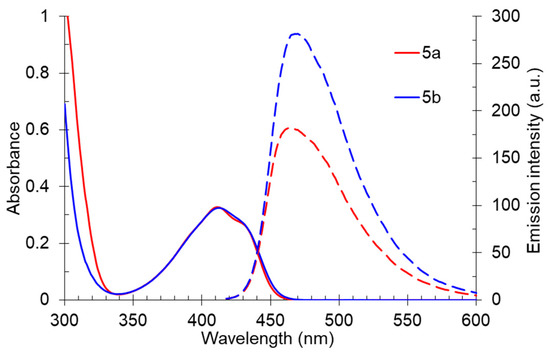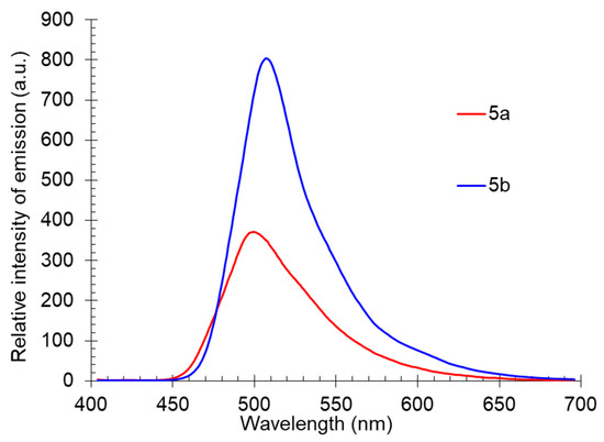 The solid-state photoluminescence spectra of compounds 5 were registered in powders at room temperature (excitation wavelength was 365 nm). The spectra demonstrated a similar dependence with solutions: the 5-methyl-substituted derivative 5b was characterized by a higher fluorescence intensity. The maxima of the solid-state emission bands of both compounds were in the yellow region of the spectra (500 nm and 507 nm) and did not show a pronounced “shoulder” (Table 3, Figure 10).