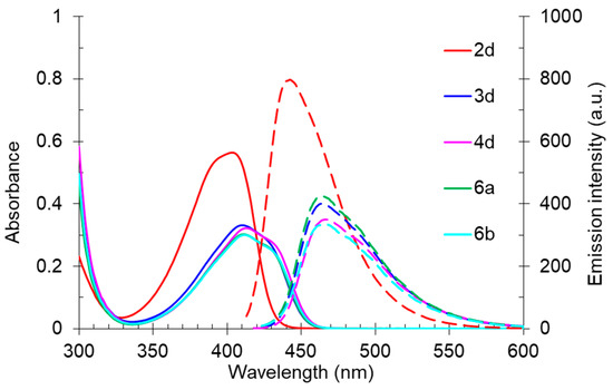 UV-vis absorption (5 × 10–5 M, solid line) and emission (5 × 10–5 M, dashed line) spectra of compounds 2d, 3d, 4d, 6a, and 6b in toluene.