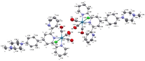 In each molecule, the Re(I) ion is co-ordinated with two pyridyl nitrogen atoms of N-methyl-piperazinyl-C6H4-terpy ligand, three facially arranged carbon atoms of three carbonyl groups and one chloro ligand, giving a distorted octahedral geometry. The uncoordinated pyridine ring is rotated by 49.83° and 62.43° from the plane of the central pyridine ring for Re(1) and Re(2), respectively. All the bond lengths and angles around the Re atom are comparable to those of the reported structurally related compounds [,,,,,,,,,]. Additional structural data are given in ESI, Tables S3–S5, and Figure S1.