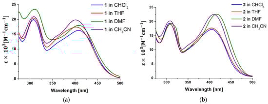 UV-Vis spectra of 1 (a) and 2 (b) in solvents of different polarity.