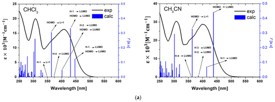The femtosecond TA spectra were measured using a pump-probe transient absorption spectroscopy system (Ultrafast Systems, Helios, Sarasota, FL, USA) described in our previous works [,]. All experiments were carried out for the solution samples (2.5 × 10−4 M, in CHCl3 and CH3CN), stirred during the experiments to avoid photoproduct interference. The absorbance range was about 0.50 in the excitation wavelengths. The samples were pumped with 355 nm (for 1 and 2). Obtained TA data were analyzed using the Surface Xplorer (Ultrafast Systems) and Optimus software []. Corrections for the probe chirp and solvent signal contributions were performed routinely prior to the analysis. The used software allowed us to perform singular value deconvolution of the 3D surface into principal components (spectra and kinetics), global analysis and decay associated spectra, DAS, of the detected transients.