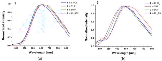 Room-temperature emission of 1 and 2 was studied in solvents of different polarities and solid-state (as a powder) upon excitation at the lowest energy absorption band. In addition, photoluminescence properties of 1 and 2 were investigated in an ethanol–methanol rigid-glass matrix at 77 K. Relevant photophysical parameters are summarized in Table 2 and Figure 4, Figure 5 and Figures S28–S33.