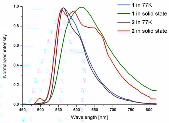 Normalized photoluminescence spectra of 1 and 2 in ethanol–methanol rigid-glass matrix (77 K) and solid state.