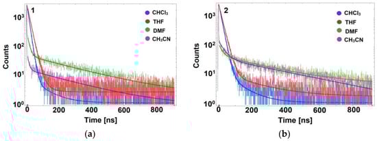 TCSPC decay curves for compounds 1 (a) and 2 (b) in different solvents.