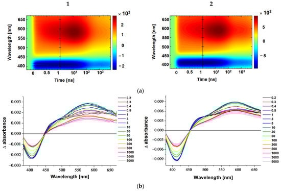 The fsTA 2D maps (a) and TA spectra at selected time delays (b) for complexes 1 and 2 in acetonitrile.