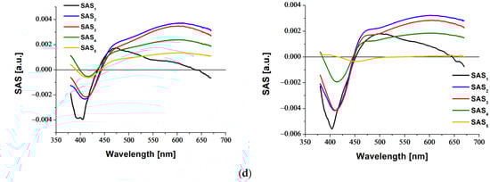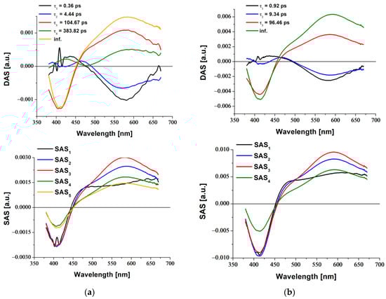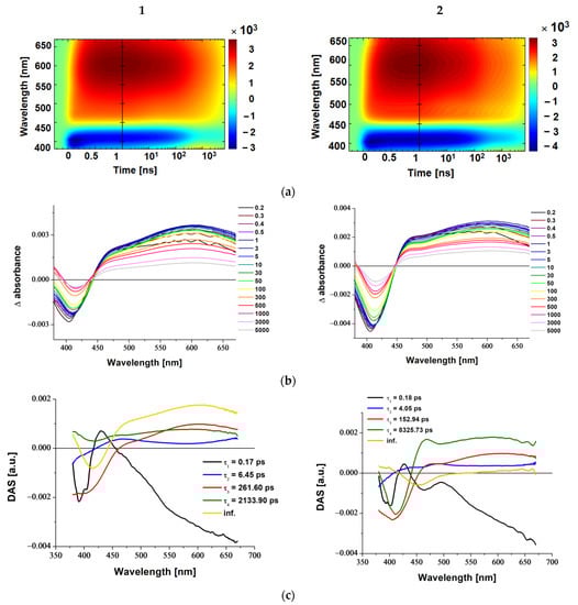 The fsTA 2D maps, TA spectra at selected time delays, decay associated spectra (DASi), and species associated spectra (SASi) of 1 and 2 compounds in CHCl3 are shown in Figure 10.