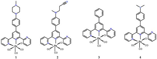 Prolonged lifetimes were also confirmed for some Re(I) carbonyls with emitting state of 3ILCT nature, for example [ReX(CO)3(phen-TPA)] (X = Cl, Br) and [ReCl(CO)3(Me2N-C6H4-terpy-κ2N)] [,]. This approach opens possibilities to modulate the properties of these systems, especially that the introduction of donor-π-acceptor type (D-A, D-π-A) ligands into a heavy metal coordination sphere is an effective way for lowering the energy gap of compounds to realize deep red or NIR light emission and offer additional advantages in optoelectronic properties due to efficient hole-transporting abilities of the bipolar systems [,,]. Regarding the convenience of structural modifications of the 2,2′:6′,2″-terpyridine framework [,,,,,,,], [ReCl(CO)3(R-C6H4-terpy-κ2N)] complexes of bidentate-coordinated 4′-(4-substituted-phenyl)-terpyridine-like ligands with strong electron-donating groups were found to be suitable systems for studies of photoinduced ILCT processes, and they were regarded as promising photoluminescence materials [,].
