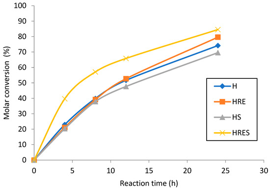 Effect of equipment on the molar conversion of octyl cinnamate. H: rotary evaporator without vacuum; HRE: rotary evaporator with vacuum; HS: ultrasonic bath; and HRES: rotary evaporator with vacuum and ultrasonic bath. The ultrasonic bath was operated at 150 W.