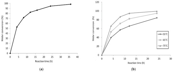 Effects of (a) reaction time, and (b) temperature, on the molar conversion of octyl cinnamate.