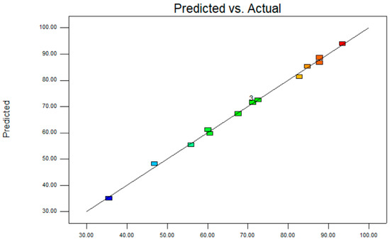 The analysis of variance is shown in Table 2. The results showed that the regression model fully reflected the actual relationship between the responses and the significant variables (R2 = 0.997). The coefficient of determination (R2) is the percentage of the variation that can be explained by the regression model in regard to the total variation. In this case, the R2 is close to 1, indicating that the developed model is well adapted. Figure 4 shows the predicted and actual conversion of octyl cinnamate. The adjusted coefficient of determination (Adj. R2 = 0.992) is also very high, indicating the high significance of the model. A “p > F” value of less than 0.05 indicates that the model (p < 0.0001) is significant. In this case, the linear terms of temperature (X1, p < 0.0001) and time (X2, p < 0.0001) provided a significant positive effect on the production of octyl cinnamate. The quadratic term of time (X22, p = 0.0003) was also statistically significant. In addition, interaction terms of temperature × time (X1 × X2; p = 0.0129) and time × power (X2 × X3; p = 0.0080) were also observed.