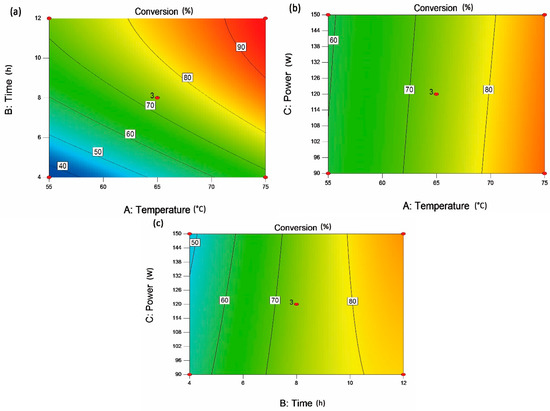Contour plots show the different reaction behaviors (a) reaction temperature and reaction time with a fixed ultrasonic power of 120 W; (b) reaction temperature and ultrasonic power with a fixed reaction time of 8 h; and (c) reaction time and ultrasonic power with a fixed reaction temperature of 65 °C. The numbers on the contours indicate the molar conversion of octyl cinnamate under specific reaction conditions.