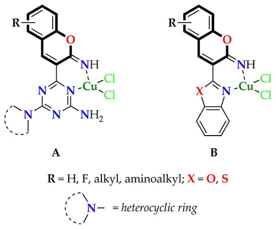 Makowska, A.; Sączewski, F.; Bednarski, P.J.; Gdaniec, M.; Balewski, Ł.; Warmbier, M.; Kornicka, A. Synthesis, Structure and Cytotoxic Properties of Copper(II) Complexes of 2-Iminocoumarins Bearing a 1,3,5-Triazine or Benzoxazole/Benzothiazole Moiety. Molecules 2022, 27, 7155. https://doi.org/10.3390/molecules27217155