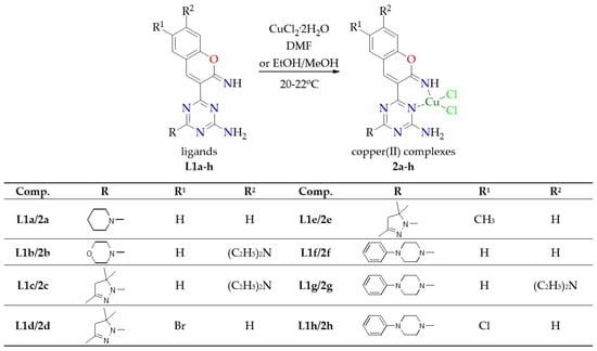 2.1.1. Synthesis of Copper(II) Complexes of 2-imino-2H-chromen-3-yl-1,3,5-triazine Derivatives 2a-h