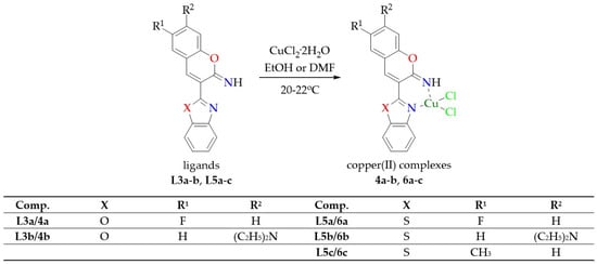 3.2.4. Synthesis of Copper(II) Complexes of 3-(benzoxazol-2-yl)-2H-chromen-2-imine Derivatives 4a-b (General Procedure)