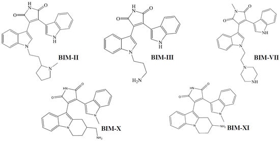 Bisindolylmaleimides (BIMs) are organics compounds derivates from indolocarbazoles, staurosporine formed by a maleimide group, and two indole groups bound to it [1]. A series of compounds have been synthesized from BIMs with different substituents in one of the indoles (Figure 1); this series includes BIM from I to XI; biological activity has been reported for these compounds. BIM I has been reported as an inhibitor of protein kinase C (PKC) [2] and glycogen synthase kinase 3 (GSK3) [3], as well as a competitive antagonist for the 5-HT3 receptor [4]. BIM II is a general inhibitor of all PKC [5]. BIMs I, II, III, IV, and V interact and inhibit ABCG2 (a transporter with potential importance in cancer drug resistance) [6]. BIM IV, in addition to inhibiting the PKC, also inhibits the cAMP-dependent protein kinase (PKA) [5]. BIM I, BIM II, BIM III, BIM VI, BIM VII, and BIM-VIII inhibit solute carrier organic cation transporter (OCT) 1, involved in the uptake of marketed drugs in the liver [7]. BIM IX is a potent inhibitor of GSK-3 [3]. BIM X is also considered an inhibitor of protein kinases (PKs) [8]. BIM XI inhibits PKC and prevents T-cell activation and proliferation [9,10]. In most of these trials, they are carried out by competitive or coupled studies, where the BIMs can interact in more than one molecular target to show the reported effects.