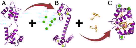 A molecular target drug that interacts with many molecules and hence regulates many metabolic pathways is the protein calmodulin (CaM). In recent years, the CaM has been the subject of various studies, including computational, thermodynamic, structural, evolutionary, and pharmacological [5,6,7,8,9,10,11]; this protein is one of the most abundant, ubiquitous, and conserved, and more than 60% of which are conserved among eukaryotes and 100% among vertebrates [12]. The sequence of CaM comprises 148 amino acids (16.7 KDa) formed by two domains containing each domain two Ca2+-binding loops known as EF-hand. CaM has no enzymatic activity but plays an essential role in calcium signaling pathways. CaM interacts with many proteins to activate or regulate the concentration of calcium intracellular [11,12]. CaM adopts three important conformations: Apo-CaM in the absence of calcium, Holo-CaM after binding Ca+2 ions where it exposes hydrophobic patches which are essential for the interaction and modulation of other proteins, and finally, the closed conformation where the protein interacts with its inhibitors (drugs or peptides) and in this conformation it is unable to perform its function (Figure 2) [13,14]; this protein is a molecular target of compounds with pharmacological activity, such as anti-cancers, antipsychotics, antidepressants, muscle relaxants, and local anesthetics. Moreover, it is involved in physiological processes such as muscle contraction, fertilization, cell proliferation, vesicular fusion, apoptosis, and others [15,16,17,18,19].