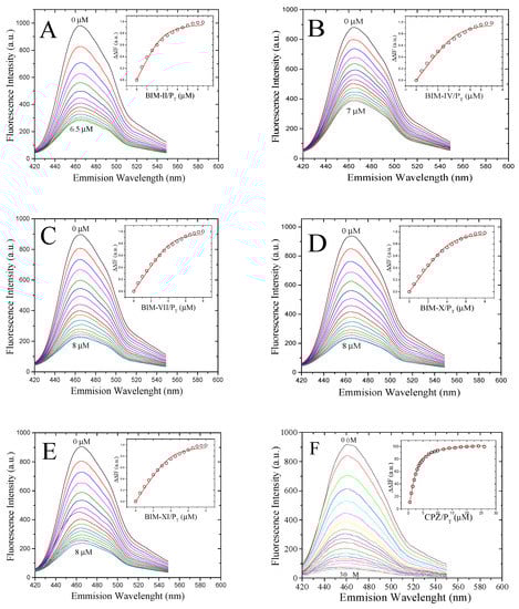 Fluorescence spectra and titration curves of Ca+2-hCaM M124C-mBBr with BIM-II (A), BIM-IV (B), BIM-VII (C), BIM-X (D), BIM-XI (E), and CPZ (F). Buffer was 10 mM of potassium acetate pH 5.1 at 37 °C. The absolute changes of maximal fluorescence emission were corrected for light scattering effects and plotted against the ligands to total protein ratio (insets). The continuous line in the insets comes from data fitting to the binding model (Equation (1) in the experimental section) to obtain the Kd.