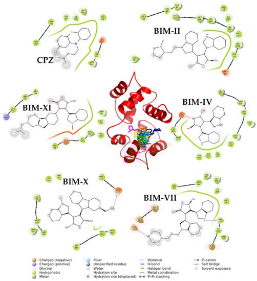 Structural model of docking results with BIMs compounds in site I of the CaM. The interactions with the residues at 4 Å are shown in the periphery. The image was made with PyMOL and Maestro.