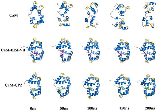 Structural models of molecular dynamics simulation of Ca2+-CaM and Ca2+-CaM-BIS-VII and, Ca2+-CaM-CPZ complexes (200 ns).