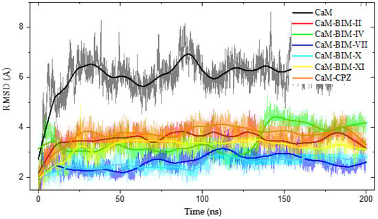 The RMSD & Time plot for 200 ns MD simulation. Shows the differences between closed CaM and CaM-BIM-II, CaM-BIM-IV, CaM-BIM-VII, CaM-BIM-X, CaM-BIM-XI, and CaM-CPZ.