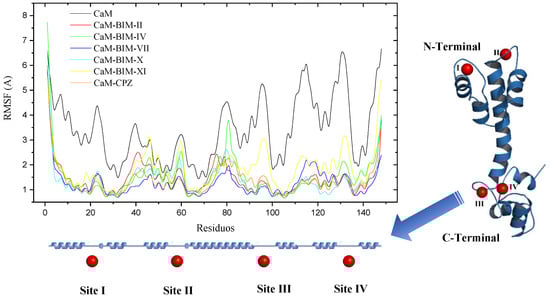 Another parameter we evaluate in MD is the Root Mean Square Fluctuations (RMSF) by amino acids of CaM, where we observe which areas of the protein present greater and lesser flexibility. Figure 9 shows us in a general way that the lobe corresponding to the C-terminal of CaM is considerably more flexible, as well as the zones corresponding to the four calcium binding sites. In the lobe corresponding to the C-Terminal are the amino acids that interact with BIMs in site I, according to docking studies, which makes sense due to the flexibility of this region. Comparing the RMSF of CaM in the absence or presence of the ligands, we can observe that the BIMs and CPZ compounds confer less flexibility to CaM in all its regions, which makes the complexes more stable in general.