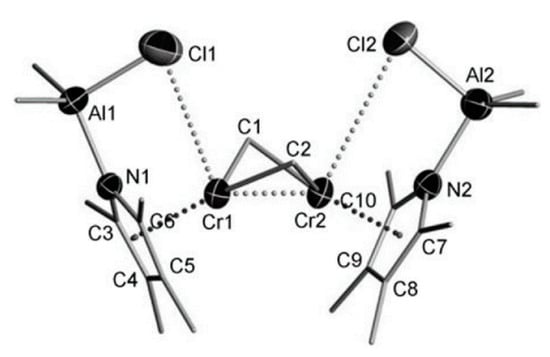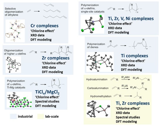 The current view of the problem is presented in Figure 1. Despite the many reviews on α-olefin and 1,3-diene functionalization, polymerization, and oligomerization, factual information about the possible role of M–(μ-Cl)–Al bonding is either absent or presented only fragmentary. In particular, M–(μ-Cl)–Al bonding was mentioned in reviews devoted to V-catalyzed olefin polymerization [44] and the Ni-catalyzed oligomerization of olefins [45,46]. In our recent review [17], we touched upon the possible role of Zr–(μ-Cl)–Al complexes in the selective dimerization of higher α-olefins, catalyzed by (η5-C5H5)2ZrCl2 (Cp2ZrCl2) and ansa-zirconocene dichlorides in the presence of 1–10 eq. methylalumoxane (MAO). The formation of Zr–(μ-Cl)–Al species during zirconocene-catalyzed hydro- and carboalumination of α-olefins is also not in doubt; however, the specific role of M–(μ-Cl)–Al in other catalytic process remains unclear [18]. To date, the comprehensive mechanistic concept, which takes into consideration M–(μ-Cl)–Al bonding in reaction intermediates and transition states of the catalytic process, has only been developed for the Cr-catalyzed trimerization of ethylene with the use of pyrrole/Cr/Et2AlX (X = Cl, Et) systems [13,47,48].