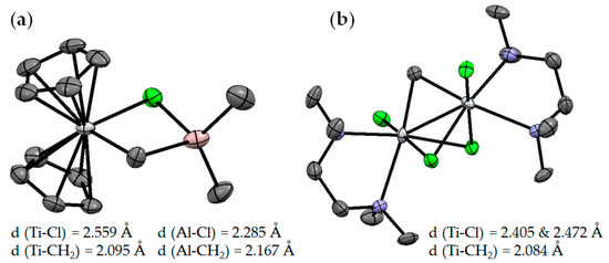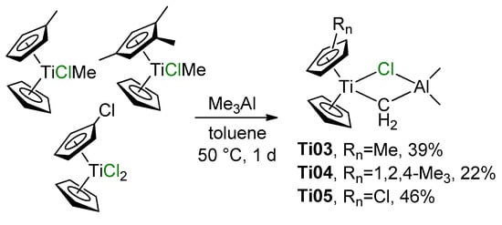 The Ti–Al heterobimetallic complex of the formula Cp2Ti(μ-Cl)(μ-CH2)AlMe2 (Ti01) was first synthesized by Tebbe et al. in 1978; the reaction of Cp2TiCl2 with AlMe3 resulted in the formation of Ti01 with 80–90% yields [49]. The synthesis of Ti01 was complicated by side reactions (Scheme 1), making it difficult to isolate the samples suitable for X-ray diffraction (XRD) analysis, and as a result, the molecular structure of Ti01 was only determined in 2014 [50] (Figure 2a). The difference between interatomic distances (d(Ti–CH2) < d(Al–CH2), d(Ti–Cl) > d(Al–Cl)) considers Ti01 as a complex of Cp2Ti=CH2 and Me2AlCl. In this way, in Ti01, Me2AlCl serves as a stabilizing agent for the Ti(IV) carbene complex, that can be removed by Lewis base.