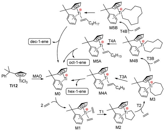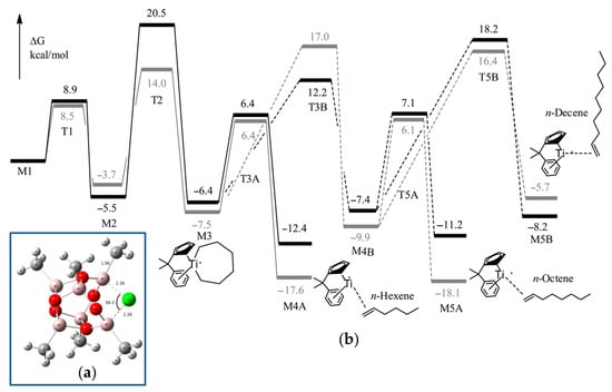 For DFT calculations, one of many possible MAO structures [85,86] was selected, namely, the cage (MeAlO)6Cl− model (Figure 4a), negatively charged due to the coordination of one Cl−, abstracted from Ti12 during activation. Two different potential free energy reaction profiles have been modeled (Figure 4b): the first only takes into account the cationic catalyst (cationic profile), whereas the second describes the energy changes in the presence of a chlorinated MAO (zwitterionic profile). The reaction starts with the activated catalyst M1 (two ethylene molecules coordinated to the cationic Ti(II) center). After oxidative coupling (M2), a third ethylene molecule coordinates and inserts with a formation of the seven-membered metallacycle (M3). This species can undergo a β-hydride transfer followed by reductive elimination (M4A), which, in turn, releases hex-1-ene. Alternatively, a fourth ethylene may coordinate to M3 and insert to yield a nine-membered metallacycle M4B. This latter species can then undergo a ring-opening reaction to yield 1-octene (M5A), or a fifth ethylene coordination and insertion can take place. The calculated barrier for β-hydride elimination in M2 (but-1-ene formation) was ~35 kcal·mol−1. Based on a comparison of cationic and zwitterionic profiles, it can be concluded that the presence of (MeAlO)6Cl− does not impact the selectivity of ethylene oligomerization. Based on the results of modeling, the authors concluded that the presence of MAO model does not necessarily need to be taken into account, and the cationic system alone is sufficiently representative.