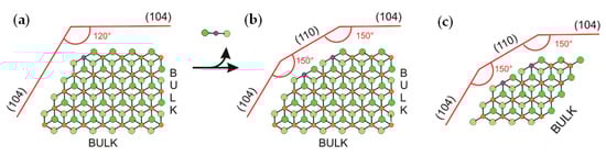 Catalytic processes occur on the TMC surface. Pre-catalysts represent TiCl4 adsorbed on MgCl2 crystallites, and the binding strength and coordination environment of the Ti atom depend on the crystal structure of the MgCl2 support. In their fundamental study [110], Cavallo et al. assumed the MgCl2 bulk to be in the α-crystalline phase with the surface comprising (104) lateral cuts (Figure 6a) that have five-coordinate magnesium centers. The removal of one MgCl2 unit results in a new (110) surface that can coordinate the titanium species (Figure 6b). Vanka et al. proposed the simpler model structure of the MgCl2 support, close in meaning to Cavallo’s model [102] (Figure 6c). In their subsequent publication, Cavallo et al. upgraded their MgCl2 model by (104)-facets presenting low-energy step-defects as potential sites for the strong coordination of TiCl4 [103].