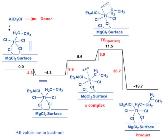The same or a similar point of view received further development in a number of studies. In their theoretical study of the active sites in TMC [102], Vanka et al. used a simplified model of the MgCl2 surface (Figure 6c) and optimized the geometries of different TI(III)–Et catalytic species that are formed during the polymerization of ethylene, including the presence of the EtO− ligand, ester donors, or Et2AlCl. In the absence of additives, the calculated difference in free activation energies ΔG≠ for the propagation and termination stages was only 1.2 kcal·mol−1. In the presence of esters, the difference increased to 12–13 kcal·mol−1 and was only 3 kcal·mol−1 when Et2AlCl served as a donor. In the latter case, Ti–(μ-Cl)–Al coordination resulted in a substantial increase in the ΔG≠ of ethylene insertion (15.8 kcal·mol−1, see Figure 7). The results of this simulation explained how polymers can be successfully produced by TMCs without alkoxy groups and donor molecules [106]. In summary, the authors suggested that the possible role of organoaluminum activators is not limited by the reduction of Ti(IV); R2AlCl can act as a donor due to its relatively weak Ti–(μ-Cl)–Al binding.