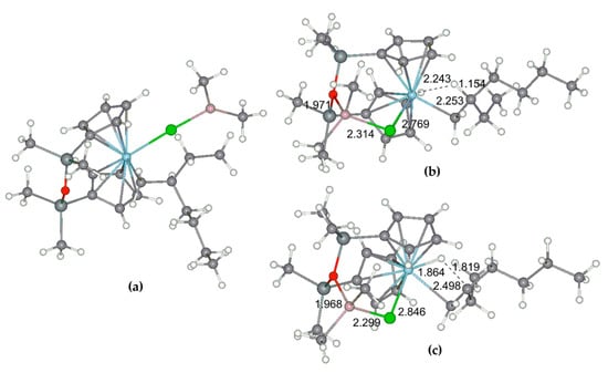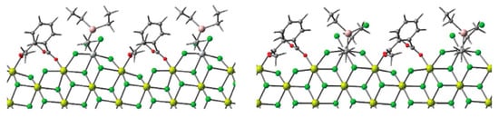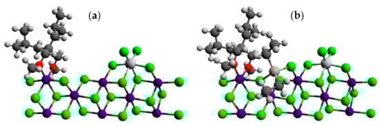 In [116], Busico’s group reported the results of an extensive experimental and theoretical investigation of the latest-generation commercial TMC. During this study, the researchers proposed a new function of R2AlCl species, namely, interactions with absorbed internal donors that provide a higher degree of stereocontrol: for the insertion of prop-1-ene at the catalytic species formed by alkylation and reduction of the TiCl4 precursors in panels (a) and (b) of Figure 9, the calculated ΔGre/si values were ≈0 and 1.5 kcal·mol−1, respectively; the latter was in good agreement with the experimental data.