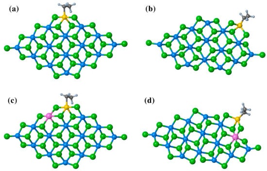 The structure of TiCl2Et adsorbed on (a) undoped (110); (b) undoped (104); (c) Al-doped (110); and (d) Al-doped (104) surfaces. Reprinted with permission from [117]. Copyright (2022) Springer Nature.