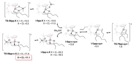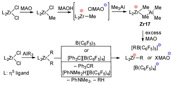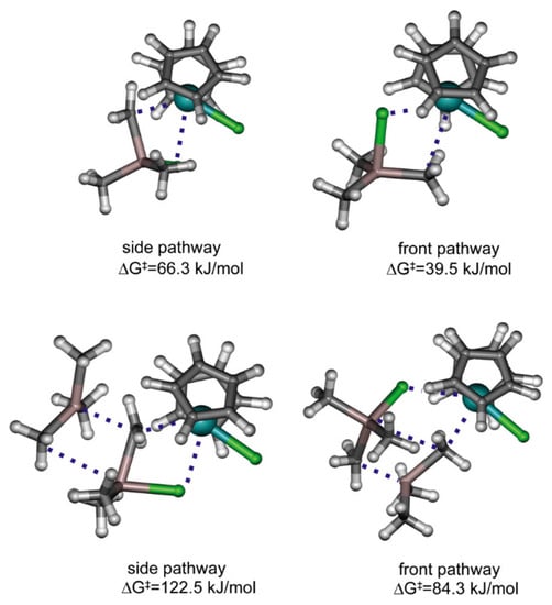 The difference in equilibria constants for this reaction can be explained based on the results of DFT modeling, as shown by Linnolahti et al., who showed that catalyst alkylation step by AlMe3 has two viable routes. AlMe3 coordinates to the metallocene either from the side or from the front, leading to corresponding alkylation reaction pathways. The kinetically favorable route is dependent on the ligand structure of the catalyst: the front pathway is preferred for Cp2ZrCl2 (Figure 11) but is sterically hindered for Me2C(Cp)(Flu)Zrl2, thereby preferring the side pathway [123]. Similar results have also been obtained in a more recent study by Kumawat and Gupta [124]. Zr01 was also detected by IR spectroscopy during studies of the activation of Cp2ZrCl2 by MAO [125].