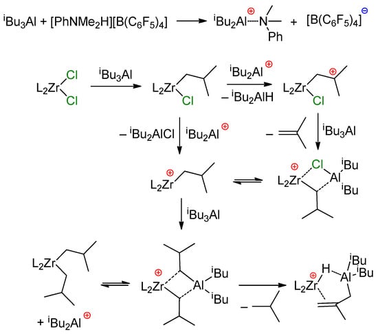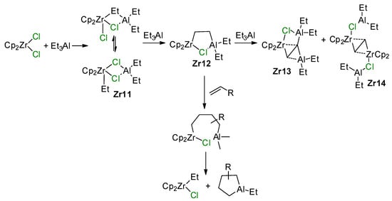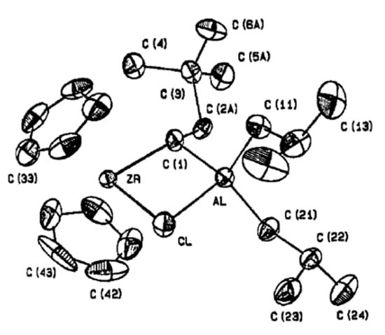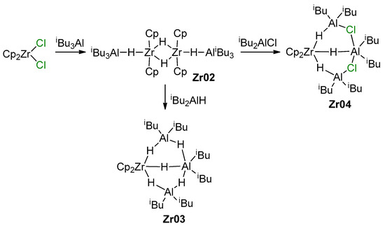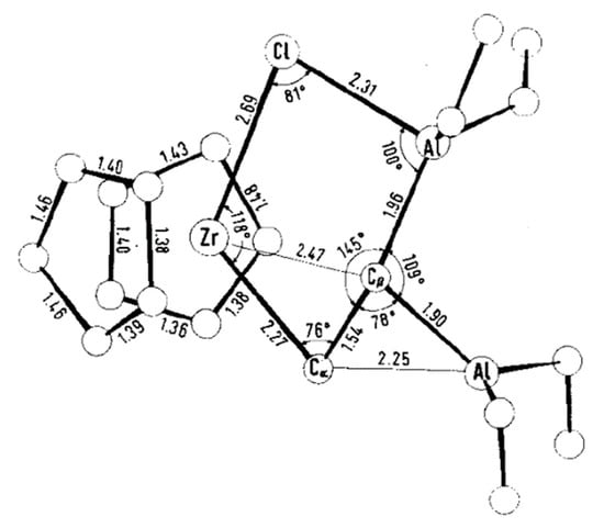 Zirconocenes have a special place among Zr-based catalysts used in α-olefin chemistry. The hydro- and carboalumination of α-olefins [18], single-site polymerization with the use of MAO and perfluoroborate activators [119], selective dimerization [37,41,42] and oligomerization [16,17] of higher α-olefins—this is not a complete list of the processes with relevance for laboratory and industry. Historically, two groups of zirconocene-based catalytic species stand apart by the criterion of the charge of the catalytic Zr center. The first, zero-charged, group is traditionally considered as catalysts of hydroalumination, carboalumiation, and cyclocarboalumination of α-olefins and related reactions, limitedly used in the laboratory [18]. The second, ‘cationic’ species, represents highly efficient single-site α-olefin polymerization catalysts with a great potential of industrial applications [1,7,120,121]. Therefore, it is no surprise that the second group of the Zr catalysts attracted and continue to attract the most research attention; however, the participation of Zr–(μ-Cl)–Al species in catalytic process has only been proven experimentally for ‘neutral’ zirconocene species.