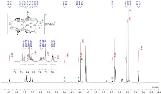 - Soshnikov, I.E.; Semikolenova, N.V.; Bryliakov, K.P.; Antonov, A.A.; Talsi, E.P. Ni(I) Intermediates Formed upon Activation of a Ni(II) α-Diimine Ethylene Polymerization Precatalyst with AlR3 (R = Me, Et, and iBu), AlR2Cl (R = Me, Et), and MMAO: A Comparative Study. Organometallics 2022, 41, 1015–1024. [Google Scholar] [CrossRef]