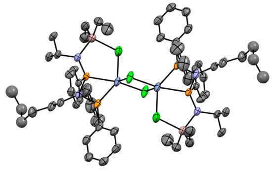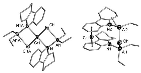 As reported by Blakemore et al., the reaction of the Ti(IV) complex (η6-C9H7)TiCl2(N=PtBu3) with Et3Al resulted in the formation of Ti(III)-Al complex Ti13 [87]. The molecular structure of Ti13 is presented in Figure 5a. Both complexes catalyzed the polymerization of ethylene being activated by Et3Al in the presence of a solid superacid. During subsequent research [88], the complexes Ti14 and Ti15 of the formula (η6-C9H7)Ti (N=PtBu3)(μ-Cl)2AlR2 (R = Me and iBu, respectively) were obtained, and the molecular structure of Ti15 (Figure 5b) was virtually identical to the molecular structure of Ti13. However, in experiments on the polymerization of ethylene, catalytic activities of the complexes decreased in the order Ti15 > Ti13 > Ti14. In this way, the nature of the substituents at Al atoms influenced the catalyst’s properties, thus indirectly confirming the presence of Ti–(μ-Cl)–Al bonding in catalytic species.