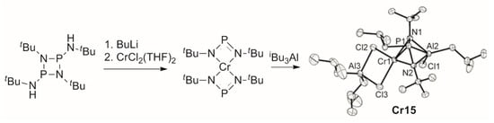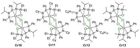 - Peitz, S.; Peulecke, N.; Müller, B.H.; Spannenberg, A.; Drexler, H.-J.; Rosenthal, U.; Al-Hazmi, M.H.; Al-Eidan, K.E.; Wöhl, A.; Müller, W. Heterobimetallic Al-Cl-Cr Intermediates with Relevance to the Selective Catalytic Ethene Trimerization Systems Consisting of CrCl3(THF)3, the Aminophosphorus Ligands Ph2PNP(Ph)NH, and Triethylaluminum. Organometallics 2011, 30, 2364–2370. [Google Scholar] [CrossRef]