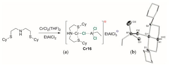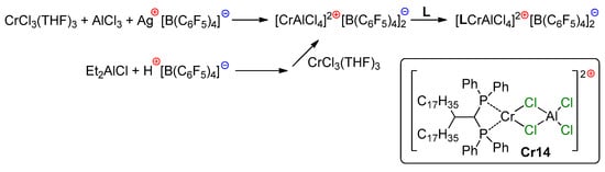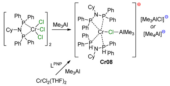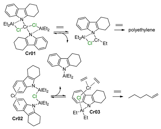 - Jabri, A.; Crewdson, P.; Gambarotta, S.; Korobkov, I.; Duchateau, R. Isolation of a Cationic Chromium(II) Species in a Catalytic System for Ethylene Tri- and Tetramerization. Organometallics 2006, 25, 715–718. [Google Scholar] [CrossRef]