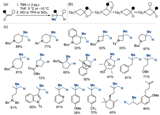 (a) General reaction scheme; (b) relative stability of titanacyclobutane intermediates; (c) scope and limitations of the titanium-mediated hydromethylation of alkenes [62].