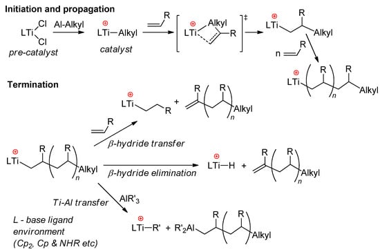 In early experiments on the single-site polymerization of ethylene, conducted by Shilov’s group, the occurrence of cationic species during the reaction of Cp2TiCl2 with Et2AlCl was regarded as an experimental criterion of the rapid catalytic process [63,64]. In the opinion of Shilov, after the intermediate formation of complex Cp2TiClEt·EtAlCl2, partial dissociation of the complex occurs, and Cp2TiEt+ is active in polymerization. For the most part, this view has not fundamentally changed in terms of the reaction mechanism, and for sandwich and half-sandwich complexes of Ti(IV), the polymerization of α-olefins includes stages of π-coordination of alkene at the Ti–Alkyl cation and insertion of the alkene via the four-membered Cossee–Arlman transition state. Possible termination events for the growing polyolefin chain are β-hydride transfer to monomer, β-hydride elimination, and Ti → Al alkyl transfer (Scheme 5) [65,66]. The main problems arising during the use of Ti(IV) sandwich complexes derive from side reactions that deactivate the active titanocene catalyst via reduction of the Ti(IV) cationic center [65]. Stabilization of the active Ti(IV) species was achieved via ligand design, with the development of half-sandwich constrained-geometry complexes (CGCs) [67,68,69,70] and different Ti(IV)-based post-metallocene catalysts [5,71].