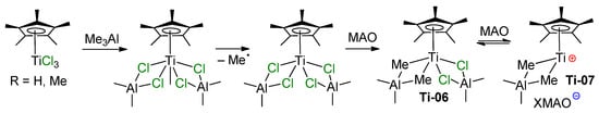 In the following model experiments on activation of Ti(IV) chloro complexes by aluminum alkyls, Ti–(μ-Cl)–Al-containing products were detected by ESR and electronic absorption spectroscopy. Thus, in the 1980s, Mach’s group studied the formation and relative stability of Ti–Al half-sandwich complexes with the formula CpTiAl2Cl8–xEtx and (η6-C6H6)TiAl2Cl8–xEtx, and demonstrated their reduced stability by increasing the number of Et fragments, x [72,73]. In 2004, Bonoldi et al. studied the activation of CpTiCl3 and (η5-C5Me5)TiCl3 (Cp*TiCl3) by different aluminum alkyls, MAO and AlMe3/[CPh3][B(C6F5)4] [74]. ESR spectral studies have shown that during the reaction of LTiCl3 with Me3Al at an Al/Ti ratio of 10:1, after 3 h, Ti(III) complexes are formed with 12% and 8% yields, respectively. This was explained by the more electron-rich nature of Cp* in comparison with Cp, which hindered an increase in the electron density by reduction (Ti(IV) + e− → Ti(III)). In the presence of MAO, complex Ti06 was formed (Scheme 6). This complex demonstrated moderate catalytic activity in the polymerization of styrene, although it is the cationic complex Ti07 that was considered as an active polymerization catalyst.