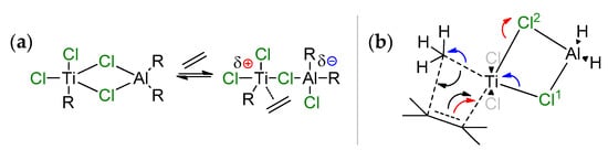 (a) Suggested scheme for partial ionization of the active center through action of the aluminum cocatalyst [75]; the authors proposed that after the cleavage of one of the Ti–Cl–Al bonds, the vacated position due to partial ionization is occupied through the coordination of ethylene; (b) ab initio modeling [78] showed that Ti–(μ-Cl)2–Al bonding is retained in the rate-limited transition state, and facilitates the insertion.