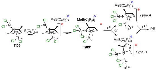 Proposed pathways of the activation of Ti09 by B(C6F5)3 [82].