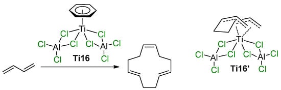 The participation of Ti–(μ-Cl)–Al species in the coordination polymerization of conjugated dienes was proposed by Mach et al., who studied the catalytic activity of η6-arene Ti complexes with AlCl3 and alkylaluminum chlorides [91,92,93]. Similar complexes of (η6-C6H6)Ti[(μ-Cl)2AlCl2]2 (Ti16) and (η6-C6Me6)Ti[(μ-Cl)2AlCl2]2 (Ti17) were obtained and structurally characterized in the late 1970s and early 1980s by Thewalt et al. [94,95]. The molecules of Ti16 and Ti17 exhibit square pyramidal geometry, with the titanium atom above the rectangle of the bridging Cl atoms and with the π-bonded arene at the apex. When Ti16 was used as a single-component catalyst of the oligomerization of buta-1,3-diene, (1Z,5E,9E)-cyclododeca-1,5,9-triene was formed with 92% selectivity (Scheme 11) [91]. The authors assumed that the high stereospecificity of the cyclotrimerization indicates that the reaction proceeds by a sterically controlled coordination mechanism. The experimental results, i.e., the approximate second-order dependence of the reaction rate on buta-1,3-diene concentration, the low concentrations of all the intermediates participating in the catalytic steps and no interaction between the catalyst and final product, suggest that cyclotrimerization may proceed via the replacement of C6H6 by two molecules of buta-1,3-diene, followed by the formation of the active species Ti16′ (Scheme 11). In the presence of EtAlCl2, Et2AlCl, and Et3Al, catalytic activity of complex Ti16 increased due to the substitution of non-bridged Cl atoms by Et groups [92]. In the presence of a large excess of Et3Al, complete deactivation of the catalyst was observed. Complex Ti17 demonstrated low activity due to higher stability of the (η6-C6Me6)–Ti bond in comparison with the (η6-C6H6)–Ti bond [93]. However, the substitution of non-bridged Cl atoms by Et groups proceeded stepwise with maximum preservation of the molecular symmetry—by an example of the complex (η6-C6Me6)Ti[(μ-Cl)2AlClEt]2 (Ti17′), for which XRD analysis was performed. This substitution resulted in a manyfold increase in the catalytic activity [93].
