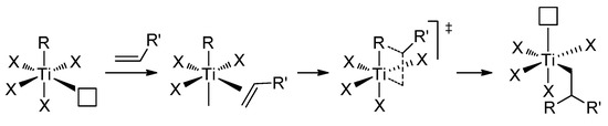 Cossee–Arlman mechanism of α-olefin polymerization [97,98]; white square indicates the vacancy of the Ti(III) atom.