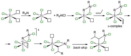In approaching the topic of modern and efficient Ziegler–Natta (ZN) catalysts, tributes should be paid to the work of Rodriguez and van Looy, who formulated heterobimetallic concepts of the reaction mechanism to explain the impact of alkylating agents on stereospecificity of TiCl3 catalyst. This concept was based on an assumption of the presence of Ti centers with two potential vacancies on the Ti atom at the surface of TiCl3 (coordination number of the Ti atom CNTi is equal to 4) [99]. According to this concept (Scheme 13), after alkylation by R3Al, a Ti–(μ-Cl)–Al complex is formed (CNTi = 5). π-Coordination and subsequent insertion of the α-olefin molecule results in an alkyl complex, which further isomerizes with occupation of the position previously occupied by the R group, thus forming the isotactic polyolefin.