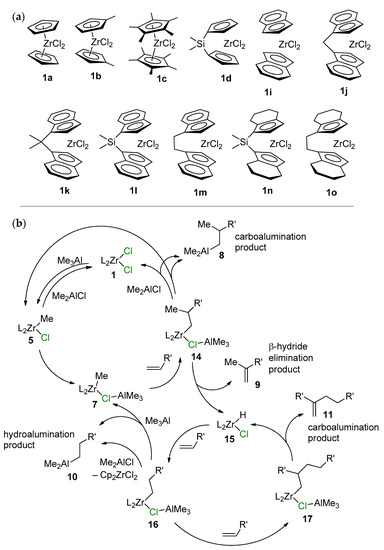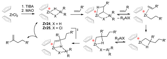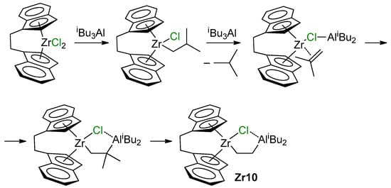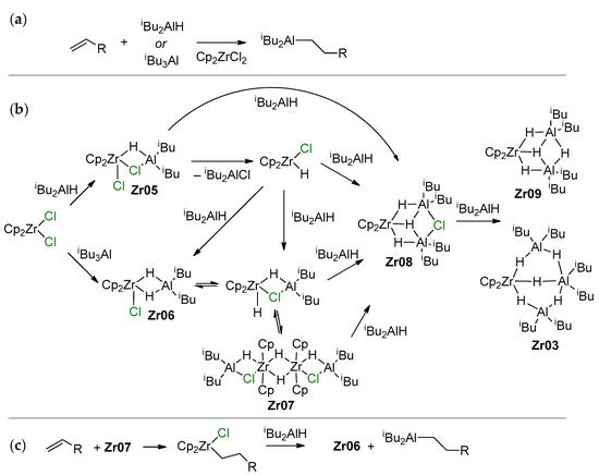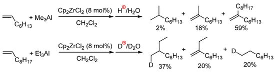The mechanisms of zirconocene-catalyzed hydroalumination and carboalumination of α-olefin were discussed ten years ago in the review by Parfenova et al. [18]. In this section, we consider only some key studies, published before 2010, and discuss the results of recent studies in more detail.