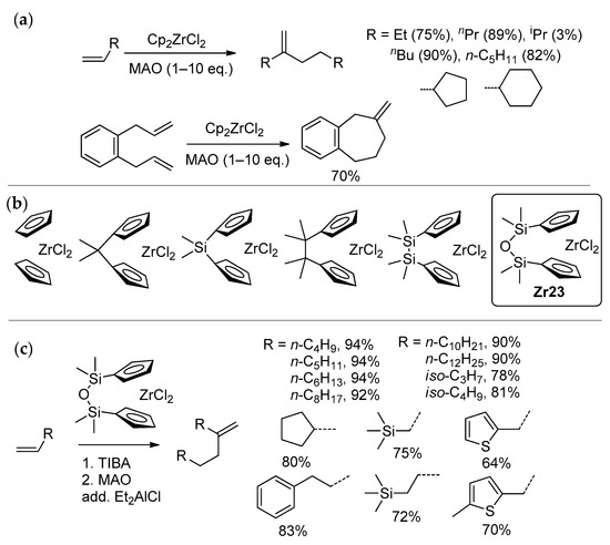 - Nifant’ev, I.E.; Vinogradov, A.A.; Vinogradov, A.A.; Bezzubov, S.I.; Ivchenko, P.V. Catalytic oligomerization of α-olefins in the presence of two-stage activated zirconocene catalyst based on 6,6-dimethylfulvene ‘dimer’. Mendeleev Commun. 2017, 27, 35–37. [Google Scholar] [CrossRef]