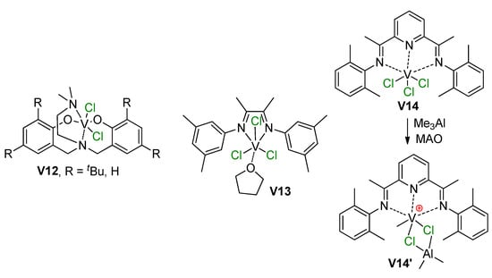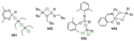 - Wu, J.-Q.; Li, Y.-S. Well-defined vanadium complexes as the catalysts for olefin polymerization. Coord. Chem. Rev. 2011, 255, 2303–2314. [Google Scholar] [CrossRef]